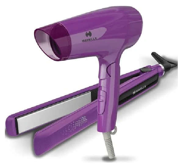 The Havells HC4025 Limited Edition Styling Combo in purple is a versatile hair styling kit designed to meet all your grooming needs. This combo includes a 1200W hair dryer and a ceramic-coated hair straightener, both featuring a sleek purple design.